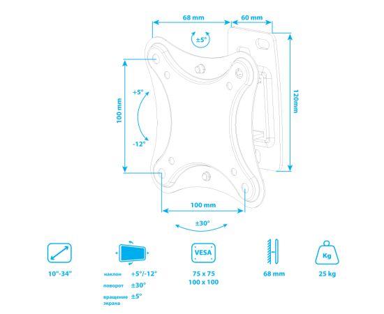 Универсальная система крепления, Легкий монтаж при помощи съемной монтажной пластины, Вращение экрана уникальная возможность вращения экрана на ±5° относительно стены, Надежная стальная конструкция максимальная нагрузка до 25 кг