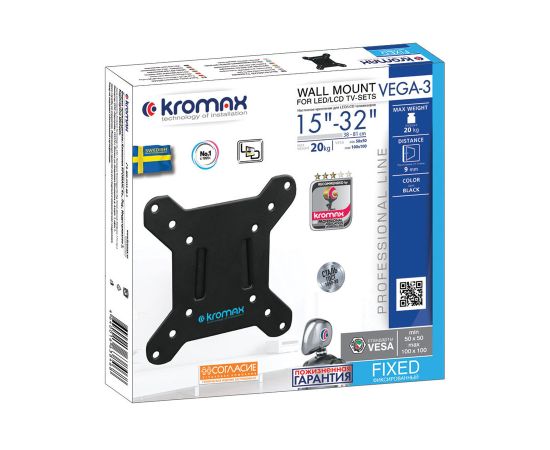 15"-32" Кронштейн Kromax VEGA-3 new Фиксированный Чёрный Нагрузка до 20кг Отступ от стены: 9мм