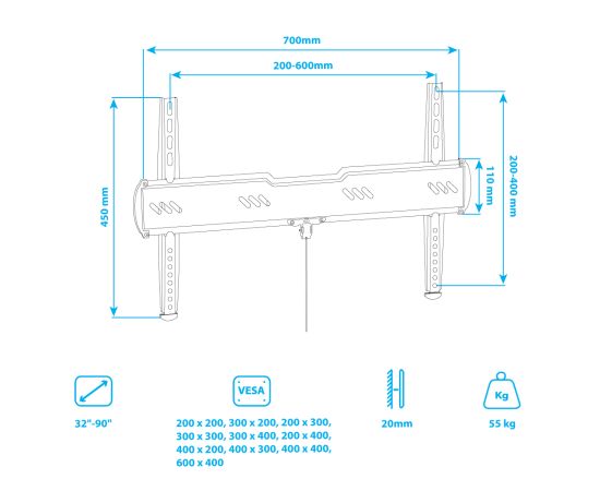 Универсальная система крепления, Мощная стальная конструкция, Легкий монтаж, Минимальное расстояние от стены 20 мм