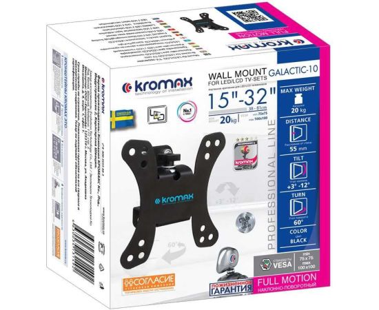 15"-32" Кронштейн Kromax GALACTIC-10 Наклонно-поворотный черный макс.20кг VESA 100x100 мм.