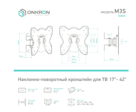 17''-42'' Кронштейн ONKRON BASIC M3S Наклонно-поворотный, черный, макс 200*200 мм, наклон -+ 8º, поворот: 45°, от стены 85 мм, макс вес 35кг