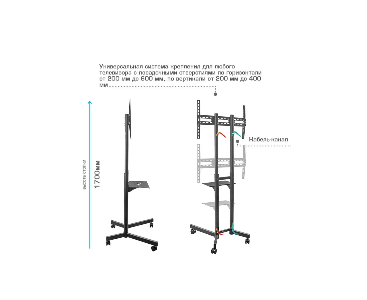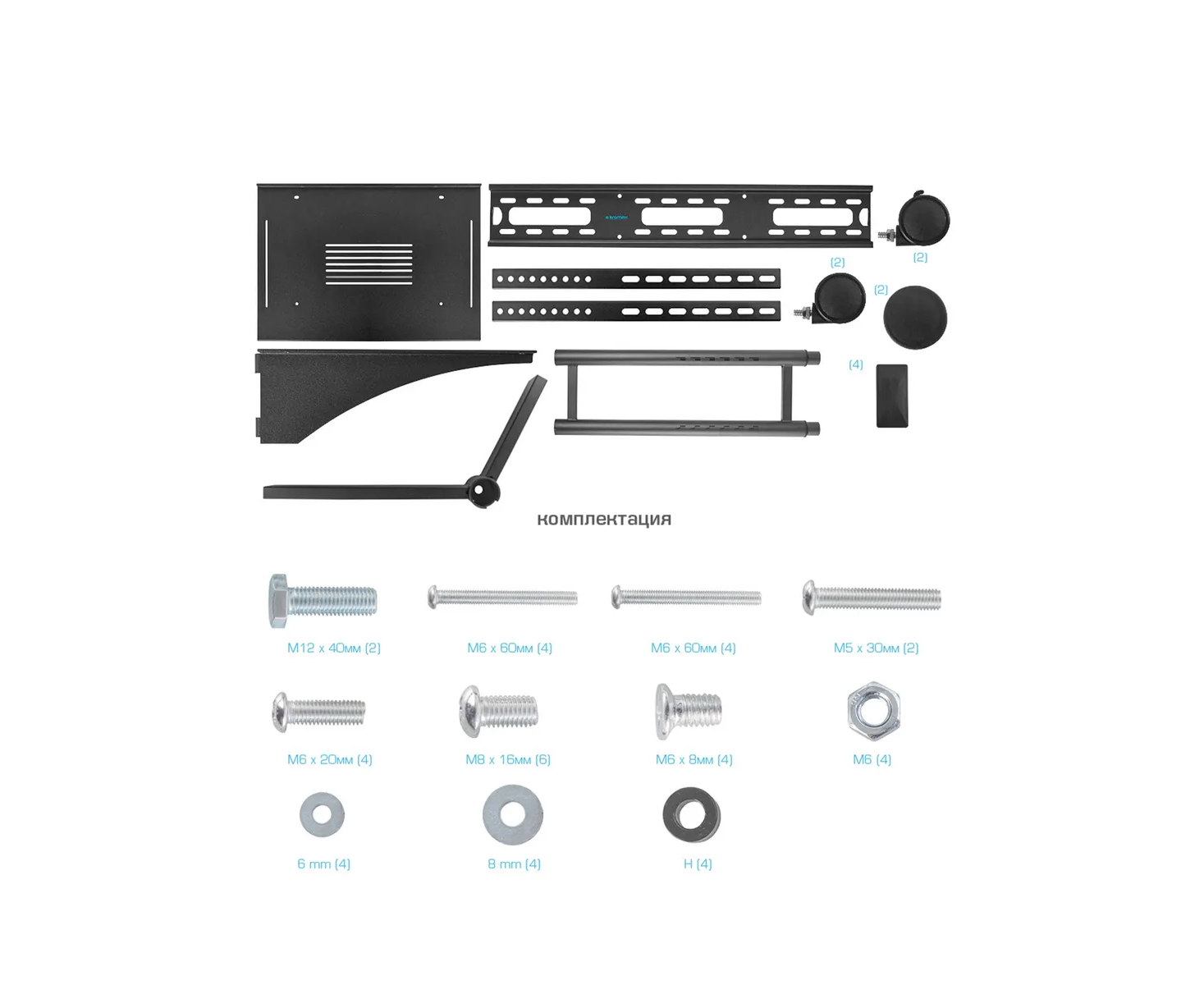мобильная стойка для телевизора; комплект ключей и крепежа для установки ТВ; навесной уровень; подробная инструкция на русском языке
