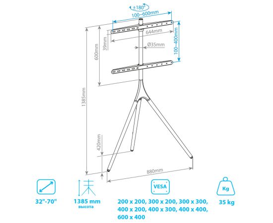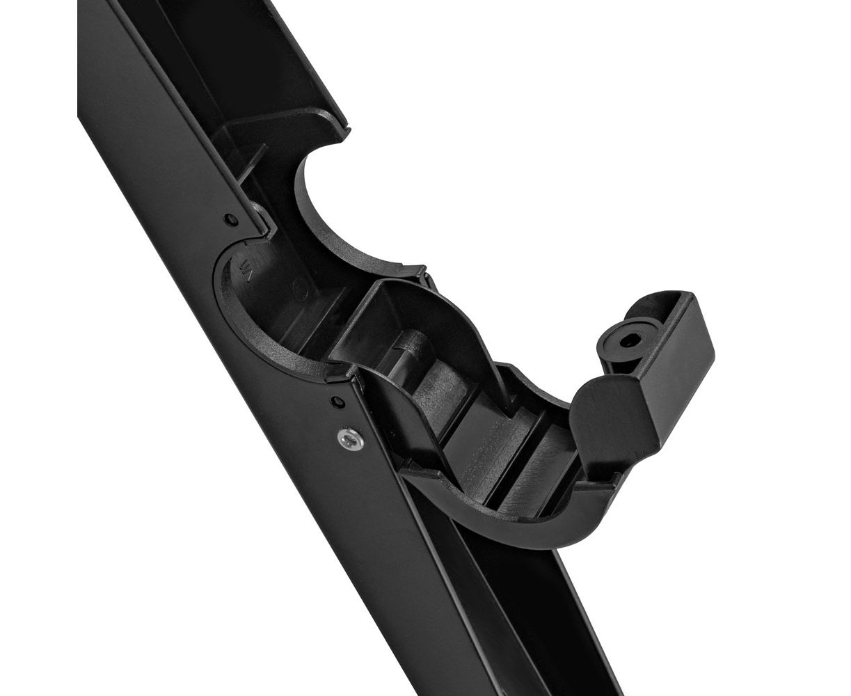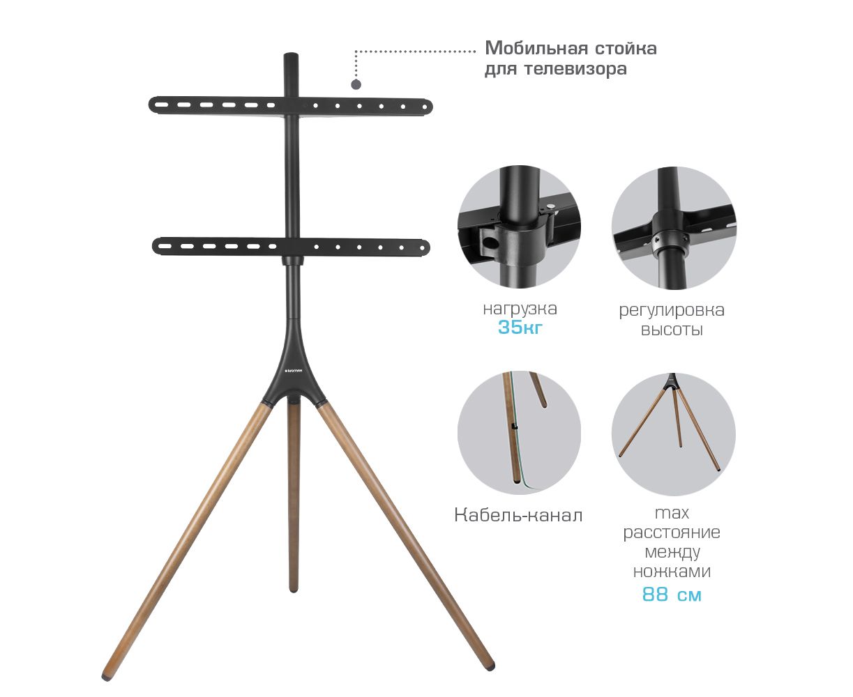 Универсальная система крепления, Надежная конструкция максимальная нагрузка до 35 кг, Резиновые накладки предотвращают скольжение и царапины на полу, Cпециальная возможность поворота , Простая установка, Кабель-канал